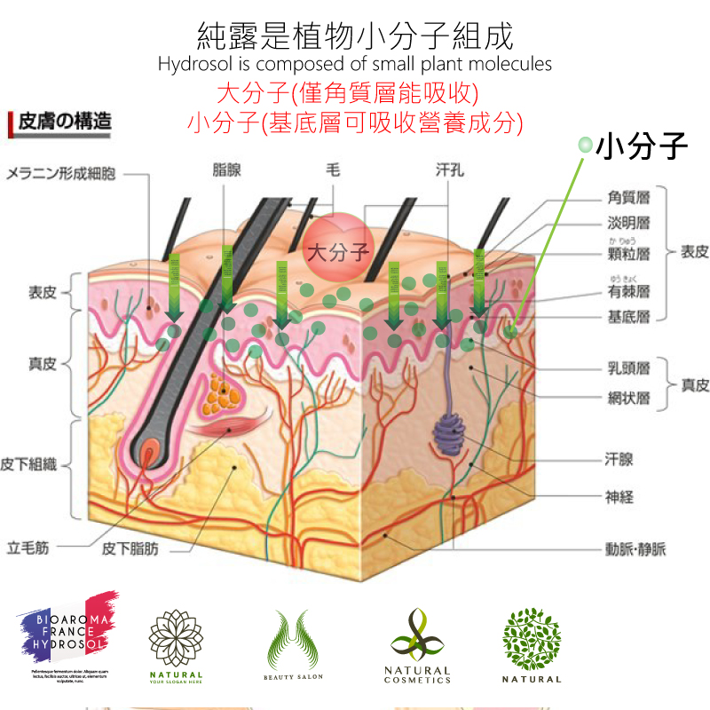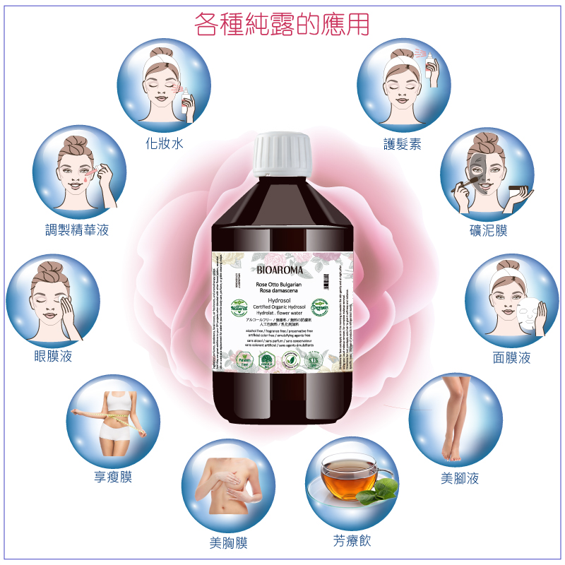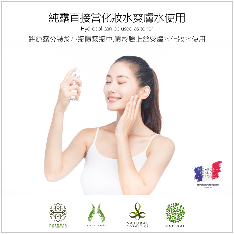 純露最主要的功能就是補水保濕,日常可以裝在小噴瓶裡隨身攜帶。與保濕噴霧用法同樣,隨時噴一噴。由於純露分子極小,皮膚可快速吸收,從而有效地令肌膚保持水潤透亮的狀態。