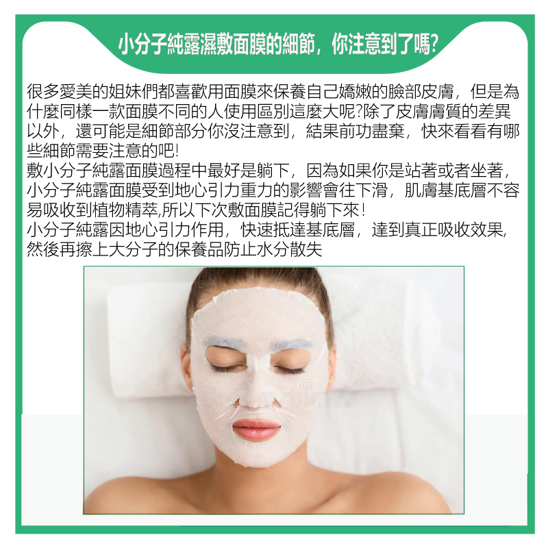 把面膜紙用純露浸濕,敷在臉上,幾分鐘就行了,主要是給皮膚保濕,但注意敷太久的話,面膜變乾後會吸走皮膚的水分,反而越敷越乾,適得其反。所以要留意時間,切勿敷太久。