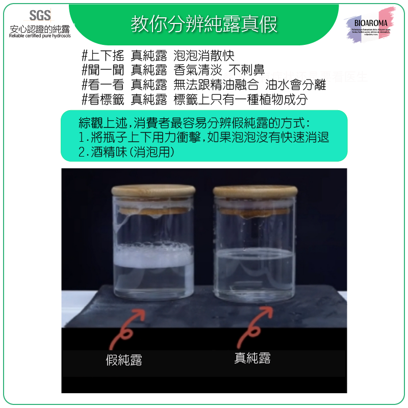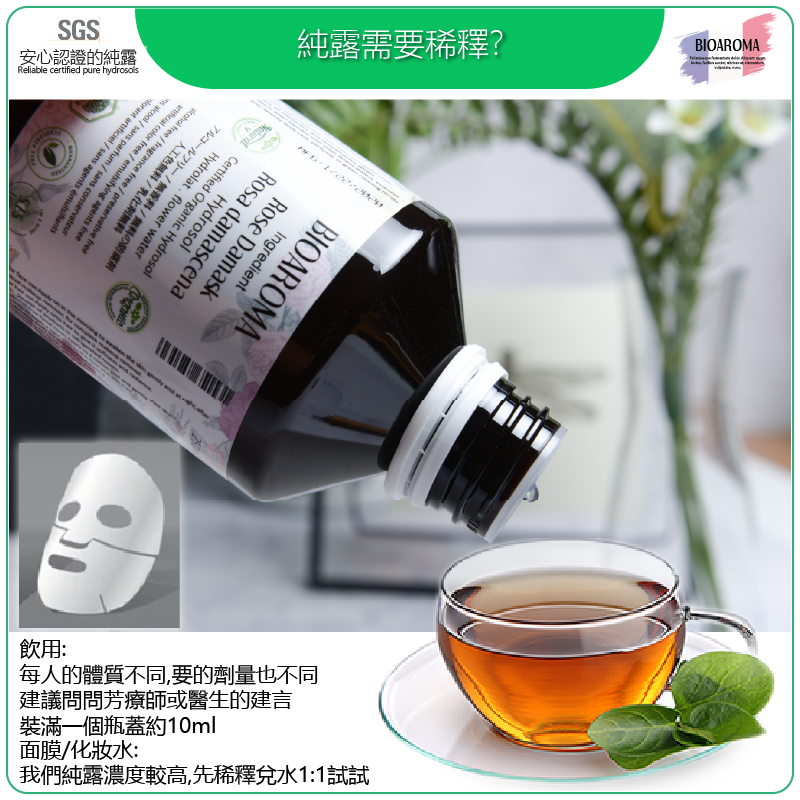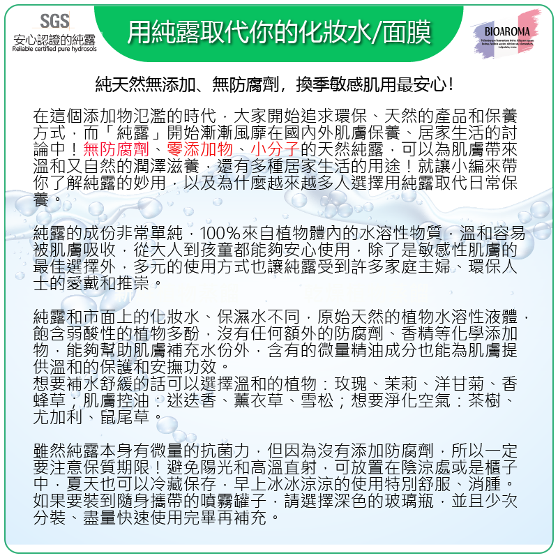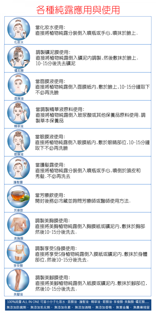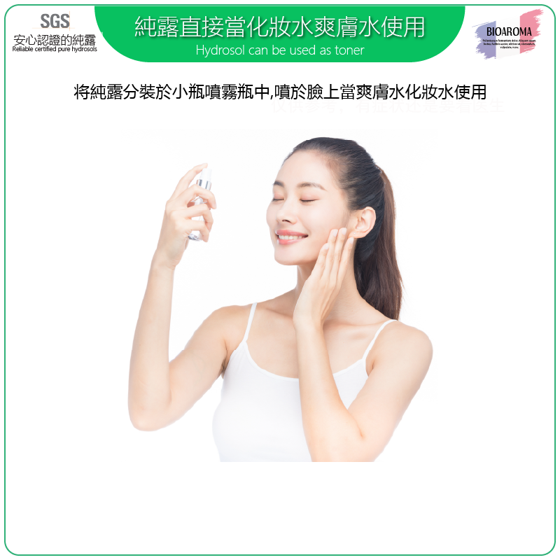 純露最主要的功能就是補水保濕,日常可以裝在小噴瓶裡隨身攜帶。與保濕噴霧用法同樣,隨時噴一噴。由於純露分子極小,皮膚可快速吸收,從而有效地令肌膚保持水潤透亮的狀態。