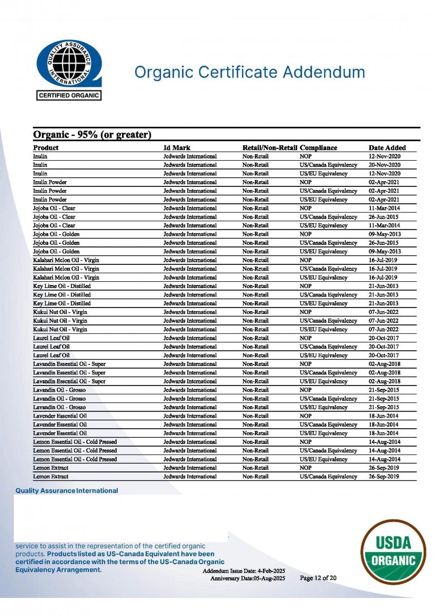 USDA, NOP certified organic Jojoba (pronounced ho-ho-ba) Oil is technically a liquid wax ester extracted from the seeds of Jojoba, a shrub-type plant that grows in dry, arid regions of southwestern United States and northern Mexico. It is considered a premium carrier oil due to its high stability and lightweight texture; it is also ideal as a carrier for liquid, non-alcohol- based perfumes. Our Jojoba Oil is the non-refined golden variety.