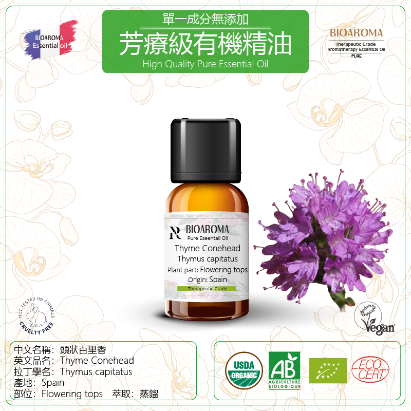 香荊芥酚(Carvacrol),對傘花烴(p-cymene),ß-丁香油烴(beta-Caryophyllene),百里酚(Thymol),γ-萜品烯(gamma- Terpinene)