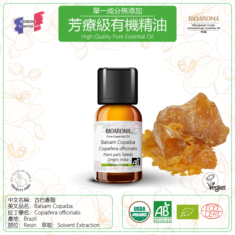 Botanical Name: Copaifera langsdorffii Desf. Origin: Brazil Process: Natural Exudate Plant Part: Natural Oleoresin (also known as a Balsam) Cultivation: Wild Harvested Use: Aromatherapy / Natural Perfumery. Always dilute. Note: Middle to Base Note, Good Fixative Aroma Families: Balsamic, Woody Aroma: Somewhat sweet, mild, soft woody, slightly spicy-peppery aroma with modest tenacity. Contraindications: None known.