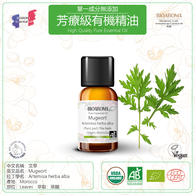 中文名稱:艾草 英文標題:Mugwort 拉丁學名:Artemisia vulgaris 產地:Morocco 部位:Flowering Tops 萃取:蒸餾