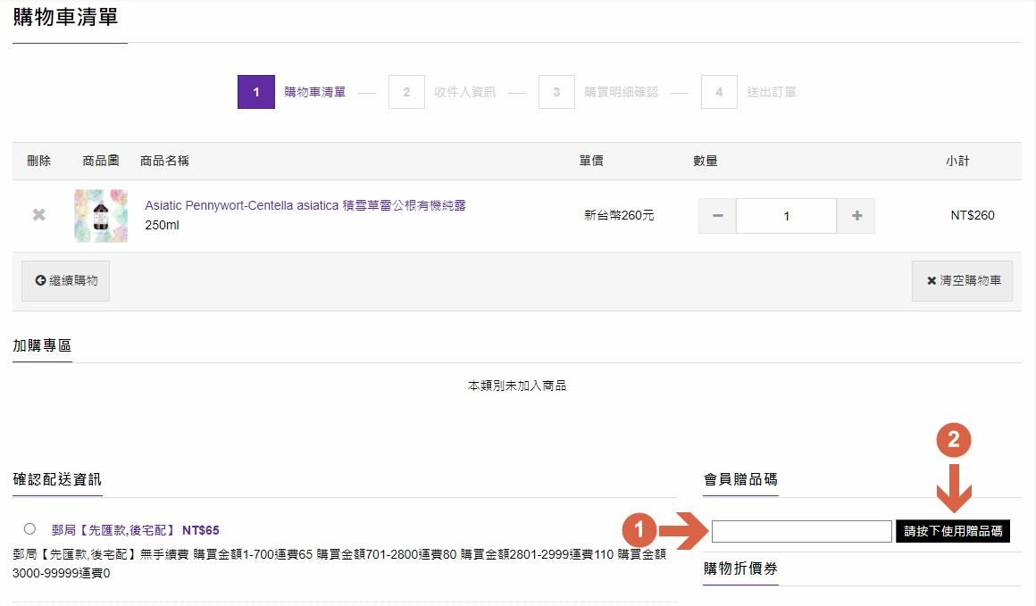 官網找不到會員贈品區,要如何使用會員贈品碼? 2023 1.先登入或註冊新會員 2.選擇購買商品,加入購物車 3.結帳 4.填入贈品碼 5.繼續.......完成訂單 6.我們收到訂單後會將贈品寄出,謝謝